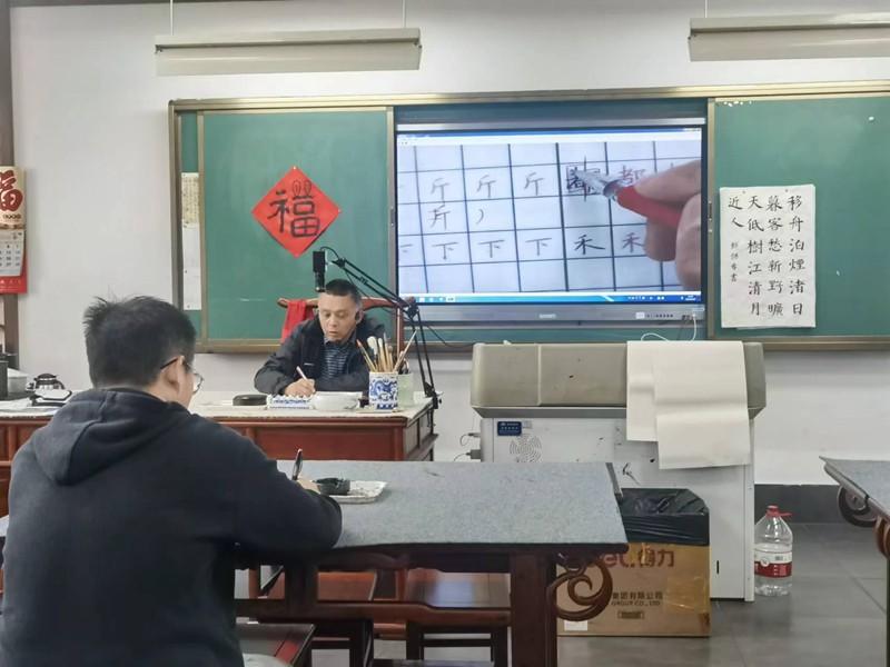 首先,许建刚布置了本节课的硬笔字培训内容和作业。然后,进入本节课的示范环节,指导学员在《永字本》上完成笔画和相关字词书写,强调了悬针竖和垂露竖在写法上的不同。接着,许建刚对学员们的书写进行指导,指导完成“斤、下、都、禾”等字词,提醒学员们在书写“斤”字时,不宜将撇写得过长,注意悬针竖起笔的位置,并且要注意悬针竖由重到轻的书写规则。学员们在观摩许建刚书写后,自行练习,反复练习许建刚老师强调的书写要点,许建刚在巡视老师们书写的同时热心回答并指导老师们的疑惑,亲手示范,对老师们的进步给予鼓励与肯定,给老师们增加了信心。