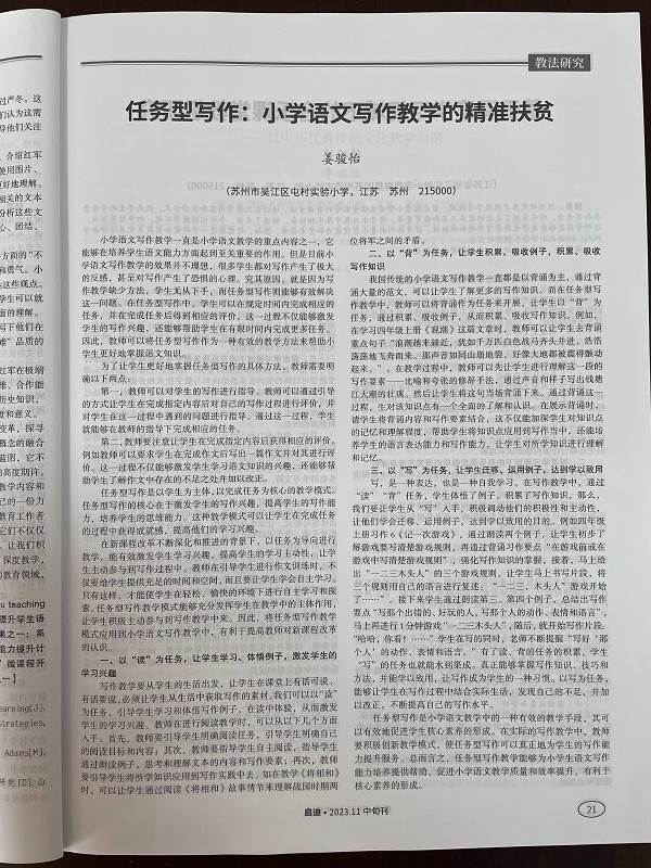 祝贺姜骏怡老师的论文《任务型写作:小学语文写作教学的精准扶贫》在省级刊物发表