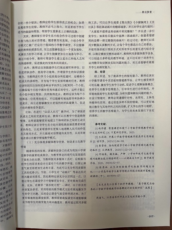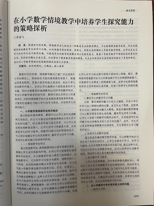 祝贺周海飞老师的论文《在小学数学情境教学中培养学生探究能力的策略探析》在省级刊物发表