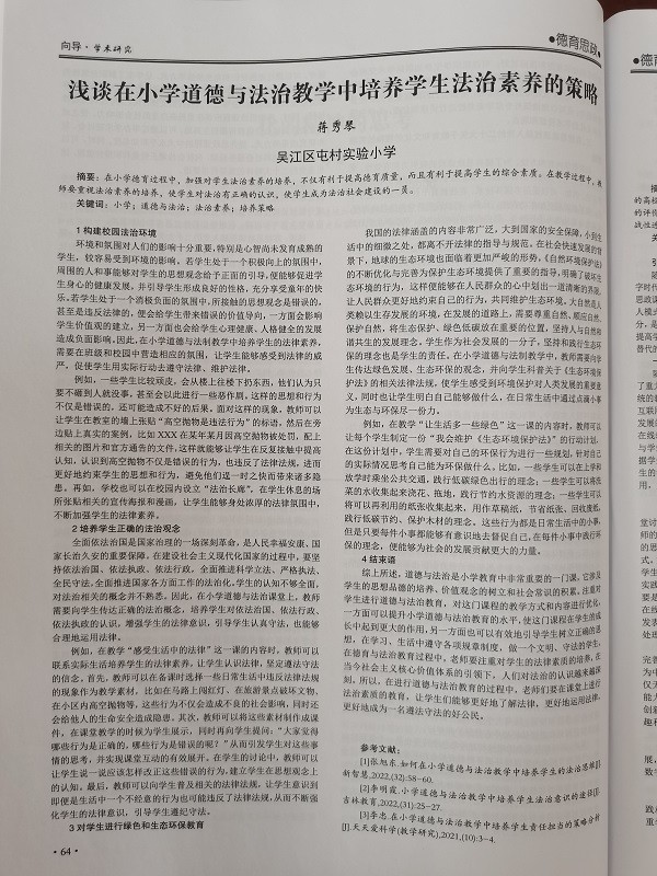 祝贺蒋秀琴老师的论文《浅谈在小学道德与法治教学中培养学生法治素养的策略》在省级刊物发表