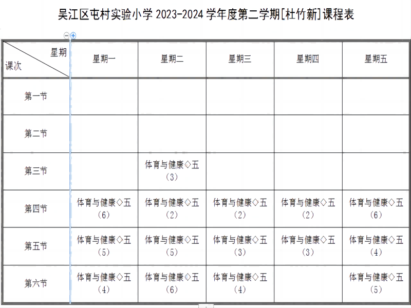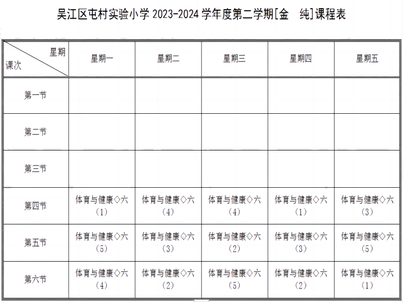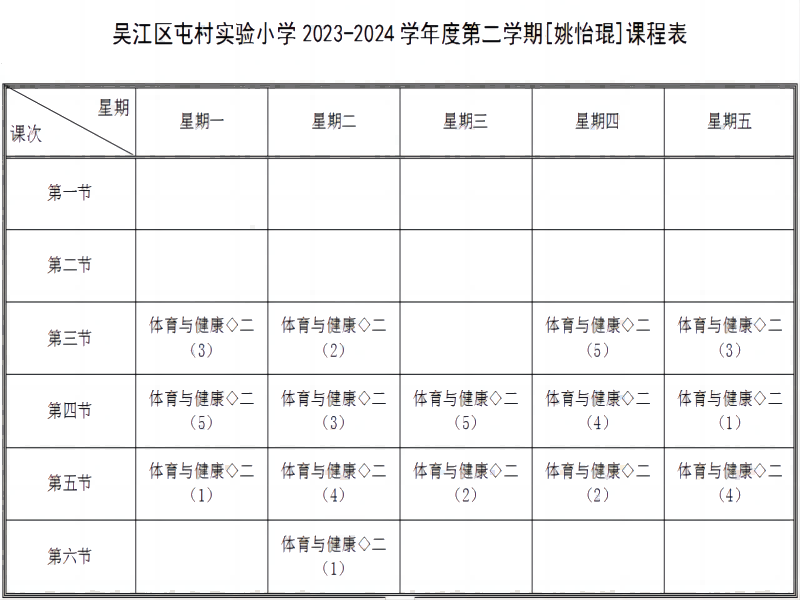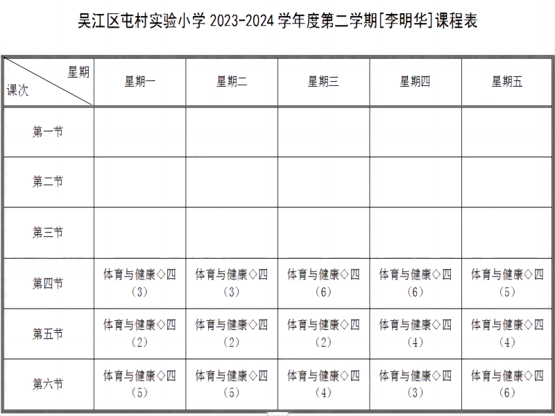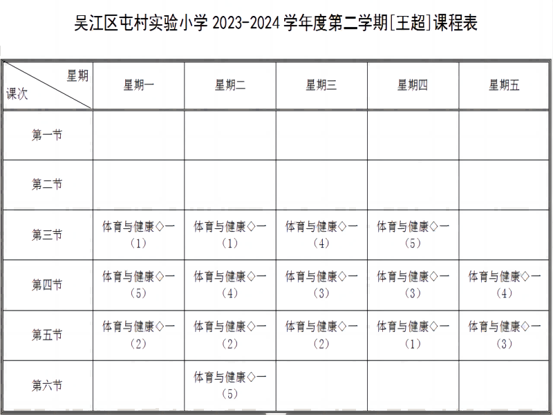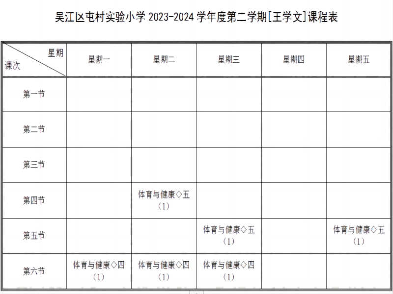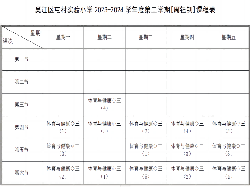 2023年度江苏省苏州市吴江区屯村实验小学学校体育教师课表
