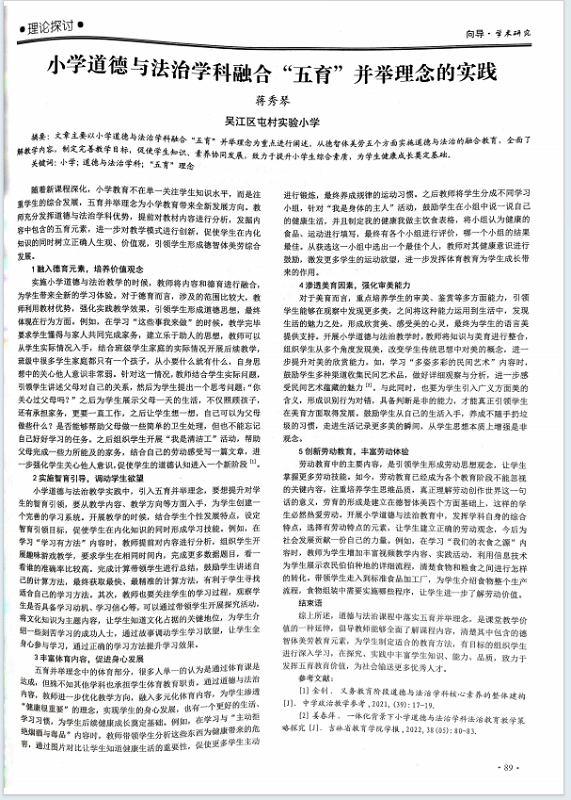祝贺蒋秀琴老师的论文《小学道德与法治学科融合“五育”并举理念的实践》在省级刊物发表