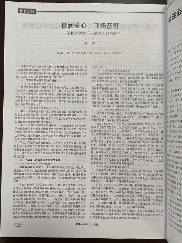 祝贺顾瑾老师的论文《德润童心 飞扬音符——浅析小学音乐与德育的有机融合》在省级刊物发表
