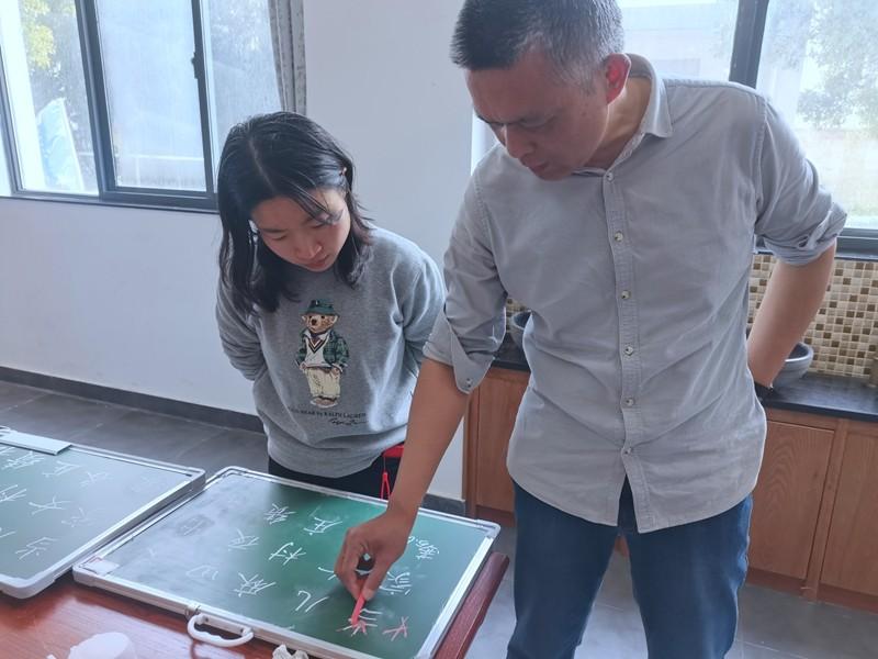首先,许建刚给学员们自由书写的时间。然后,进入本节课的示范环节,指导学员在小黑板上完成相关笔画和诗句,强调了教师在黑板上书写板书时要注意笔画的粗细以及用笔。接着,许建刚对学员们的书写进行指导,指导完成诗句,逐字教学。提醒学员们在书写使用粉笔时,要注意把字写在格子正中间,必要时画上辅助线帮助学生了解字形结构。学员们在观摩许建刚书写后,自行练习,反复练习许建刚老师强调的书写要点,许建刚在巡视老师们书写的同时热心回答并指导老师们的疑惑,亲手示范,对老师们的进步给予鼓励与肯定,给老师们增加了信心。