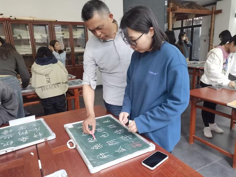 首先,许建刚给学员们自由书写的时间。然后,进入本节课的示范环节,指导学员在小黑板上完成相关笔画和诗句,强调了教师在黑板上书写板书时要注意写粉笔笔画时的快慢。接着,许建刚对学员们的书写进行指导,指导完成诗句,逐字教学。提醒学员们在书写使用粉笔时,要注意落笔的快慢,努力尝试写出笔画粗细。学员们在观摩许建刚书写后,自行练习,反复练习许建刚老师强调的书写要点,许建刚在巡视老师们书写的同时热心回答并指导老师们的疑惑,亲手示范,对老师们的进步给予鼓励与肯定,给老师们增加了信心。