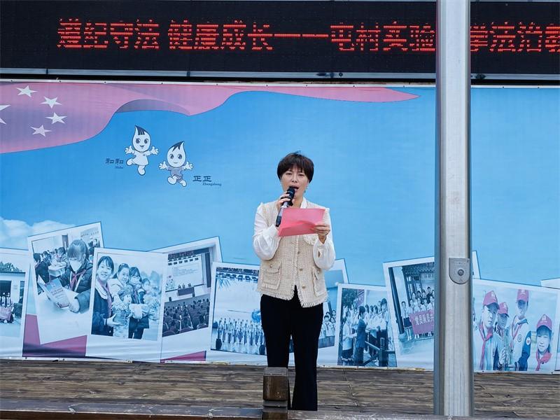 伴随着雄壮的国歌,全体师生庄严肃立。六(5)中队的光荣升旗手潘文博呼吁队员们要知法守法、与法同行,不断增强法治观念,自觉抵制不良行为,养成良好的行为习惯,做新时代积极向上、奋发有为的好少年。蒋秀琴副校长在总结发言中深入阐述了师生在日常生活中应如何自觉遵守法律、积极维护法治秩序等,为师生们提供了宝贵的法治教育指导。