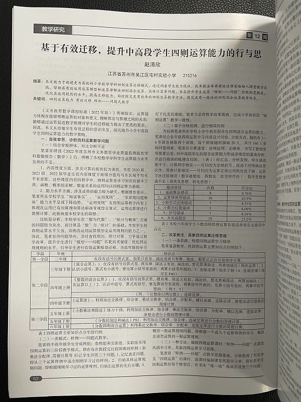 祝贺赵清欣老师的论文《基于有效迁移,提升中高段学生四则运算能力的行与思》在省级刊物发表
