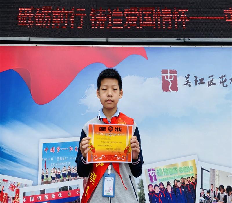 伴随着雄壮的国歌,全体师生庄严肃立。六(4)中队的光荣升旗手王子谦进行了以《爱国,从身边做起》为主题的演讲,她深情述说了那些为了新中国的成立而抛头颅、洒热血、无私奉献的英雄们的光辉业绩,呼吁大家要以实现中华民族伟大复兴为己任,从身边小事做起,践行爱国使命。随后大队辅导员林老师为她颁发了光荣升旗手奖状。