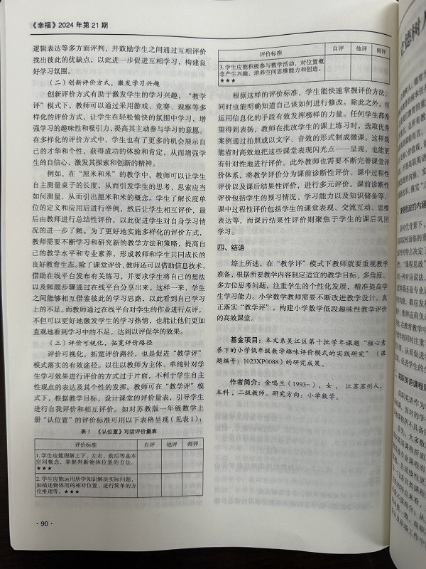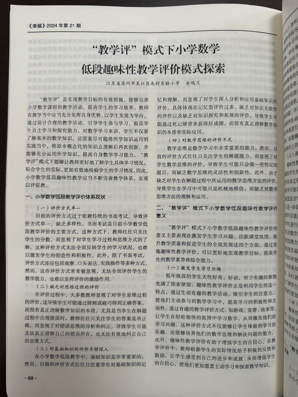 祝贺金鸣兰老师的论文《“教学评”模式下小学数学低段趣味性教学评价模式探索》在省级刊物发表。