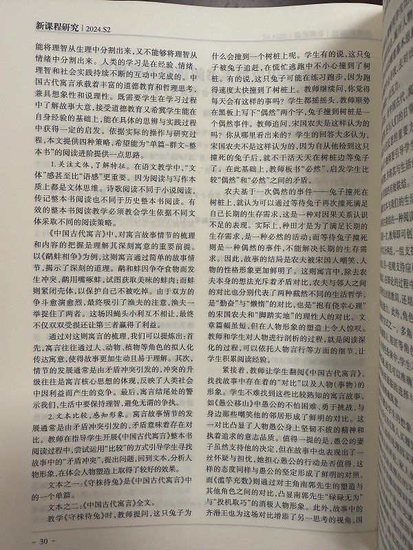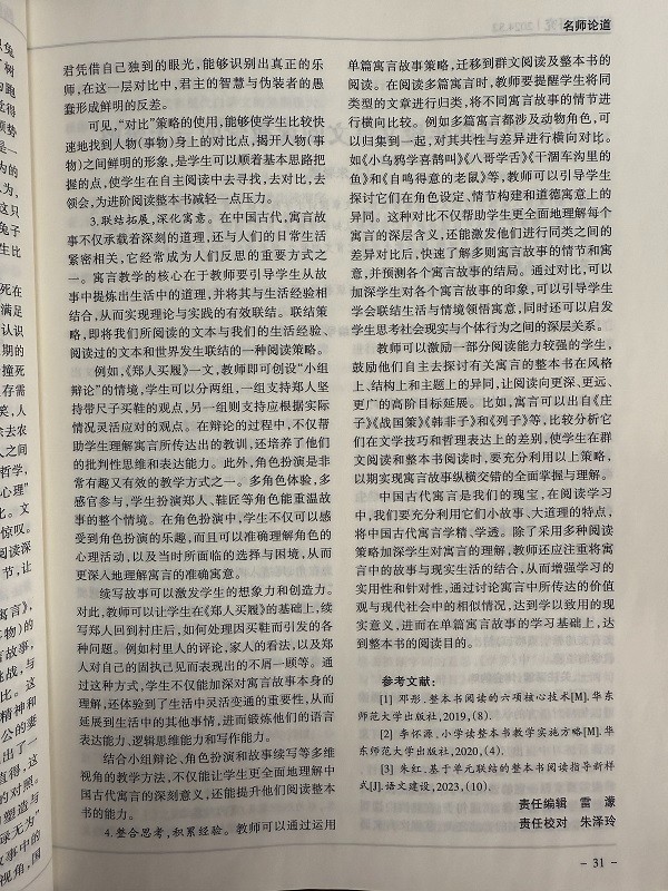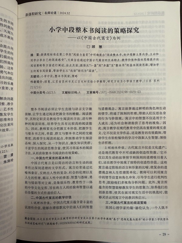 祝贺顾慧老师的论文《小学中段整本书阅读的策略探究——以<中国古代寓言>为例》在省级刊物发表