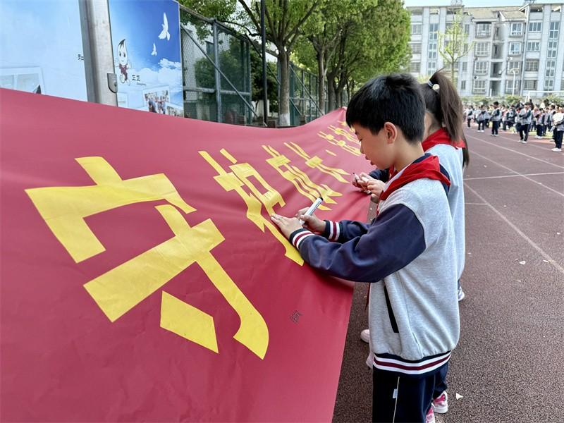 随后,大队长于跃宣读了学习未成年人保护法倡议书,呼吁全体同学尊法、学法、守法、用法。同学们纷纷响应,以实际行动表明践行法治的决心。紧接着,各年级学生代表有序来到横幅前,郑重签下自己的名字,许下法治承诺。