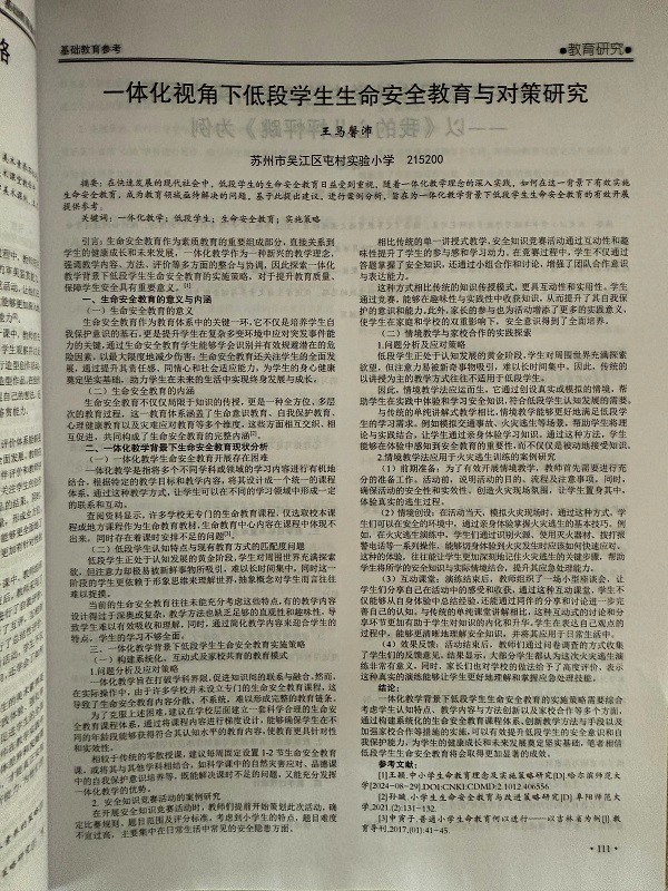 祝贺王马馨沛老师的论文《一体化视角下低段学生生命安全教育与对策研究》在省级刊物发表