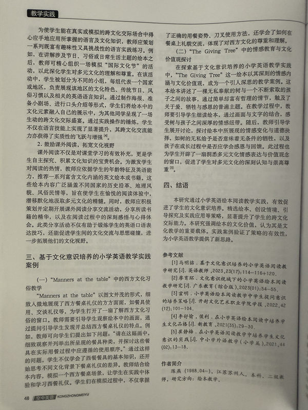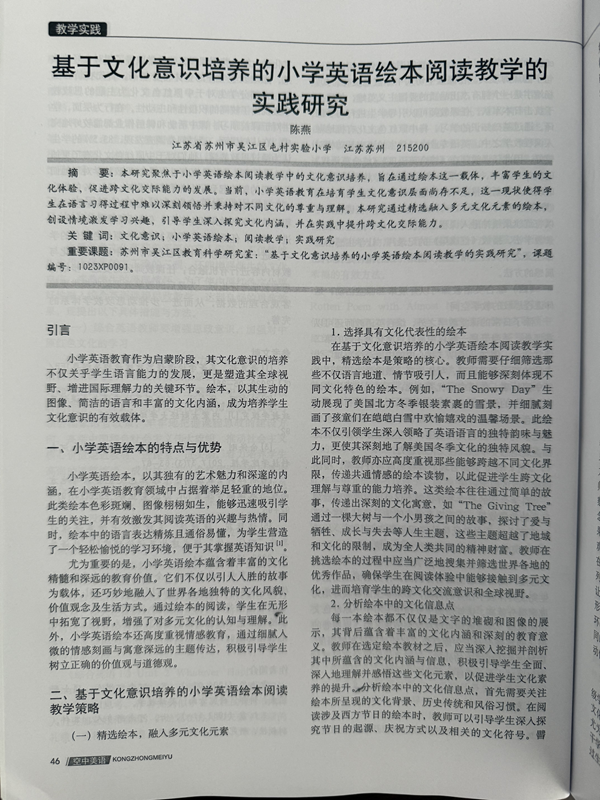 祝贺陈燕老师的论文《基于文化意识培养的小学英语绘本阅读教学的实践研究》在省级刊物发表