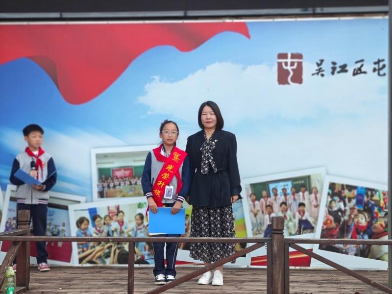 伴随着庄严的国歌声,五星红旗冉冉升起,全体师生肃立行礼。本次担任光荣升旗手的是五(5)班沈思辰同学,徐校长为她佩戴了“光荣升旗手”绶带。