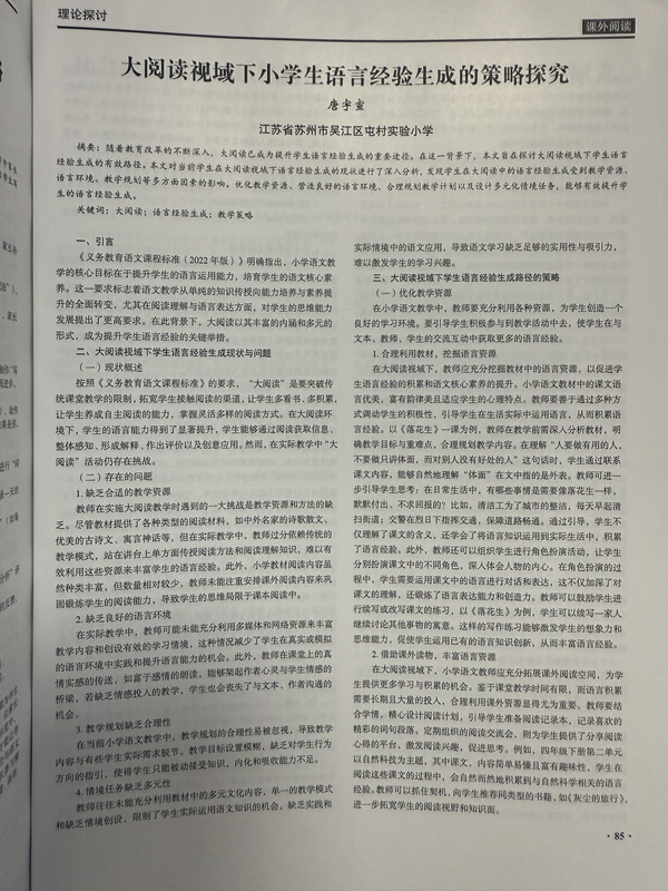 祝贺唐宇宣老师的论文《大阅读视域下小学生语言经验生成的策略探究》在省级刊物发表