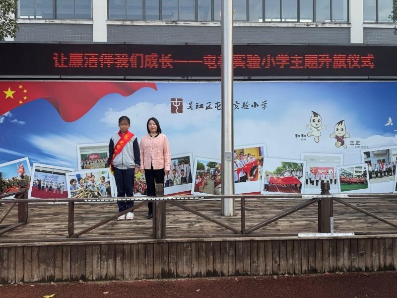在庄严的国歌声中,五星红旗冉冉升起,全体师生肃立行礼,向国旗致以崇高敬意。本次担任光荣升旗手的是五(3)班盛绮蕾同学,徐校长为她佩戴了“光荣升旗手”绶带。