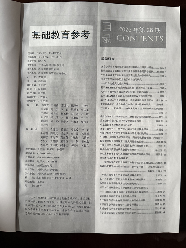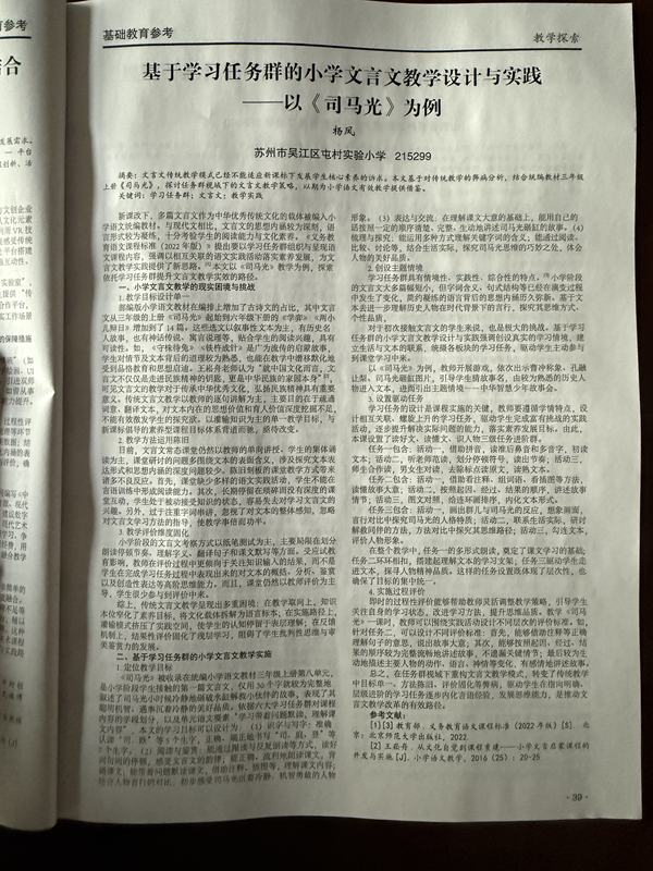 祝贺杨凤老师的论文《基于学习任务群的小学文言文教学设计与实践——以<司马光>为例》在省级刊物发表