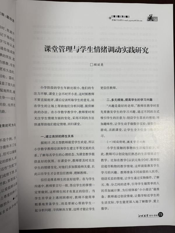 祝贺顾丽英老师的论文《课堂管理与学生情绪调动实践研究》在省级刊物发表